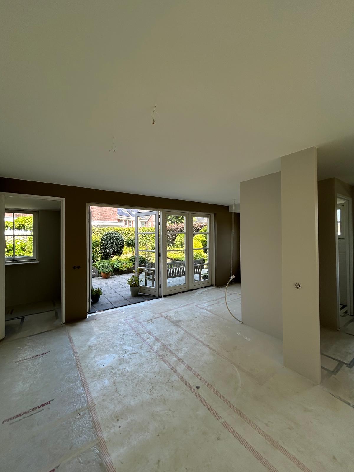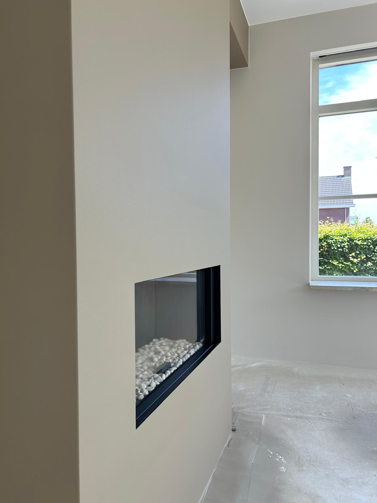 In deze woning hebben we alle wanden en plafonds volledig voorbereid, afgeplakt en strak gespoten. De combinatie van warme en lichte tinten zorgt voor diepte en rust in de ruimtes. Rondom kozijnen, ramen en hoeken is met uiterste precisie gewerkt om haarscherpe lijnen te creëren.
