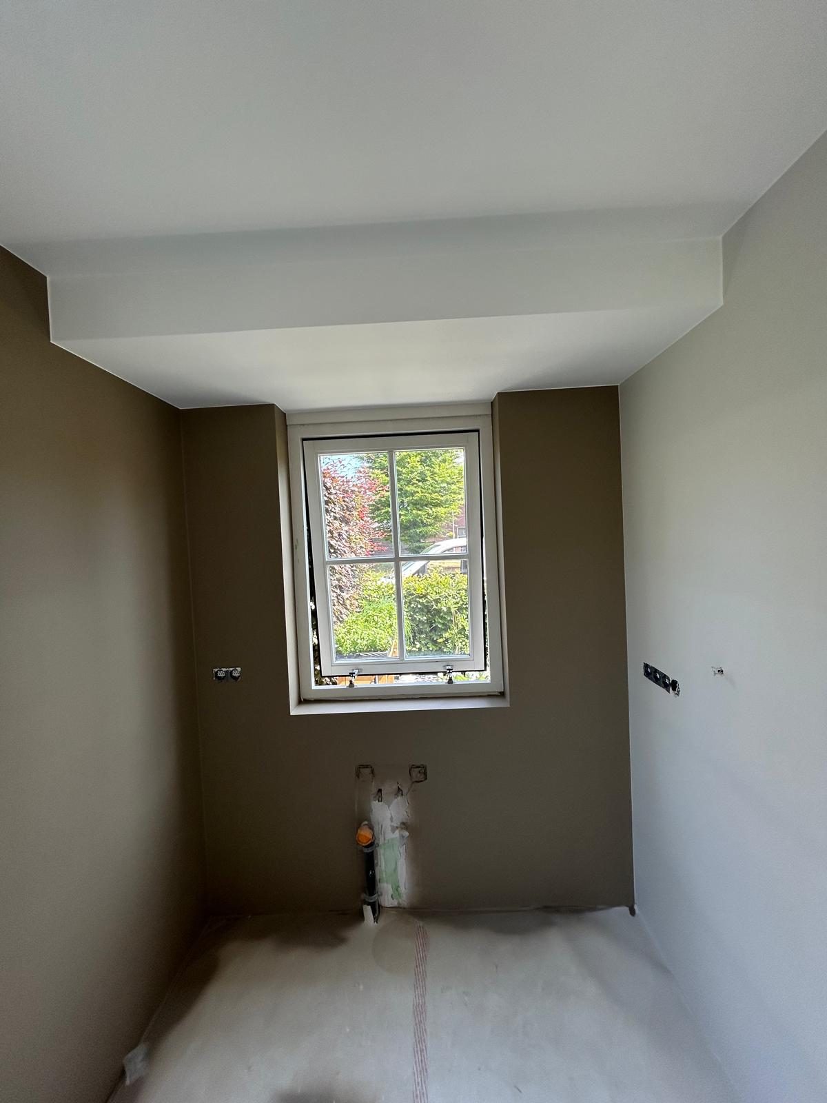 In deze woning hebben we alle wanden en plafonds volledig voorbereid, afgeplakt en strak gespoten. De combinatie van warme en lichte tinten zorgt voor diepte en rust in de ruimtes. Rondom kozijnen, ramen en hoeken is met uiterste precisie gewerkt om haarscherpe lijnen te creëren.