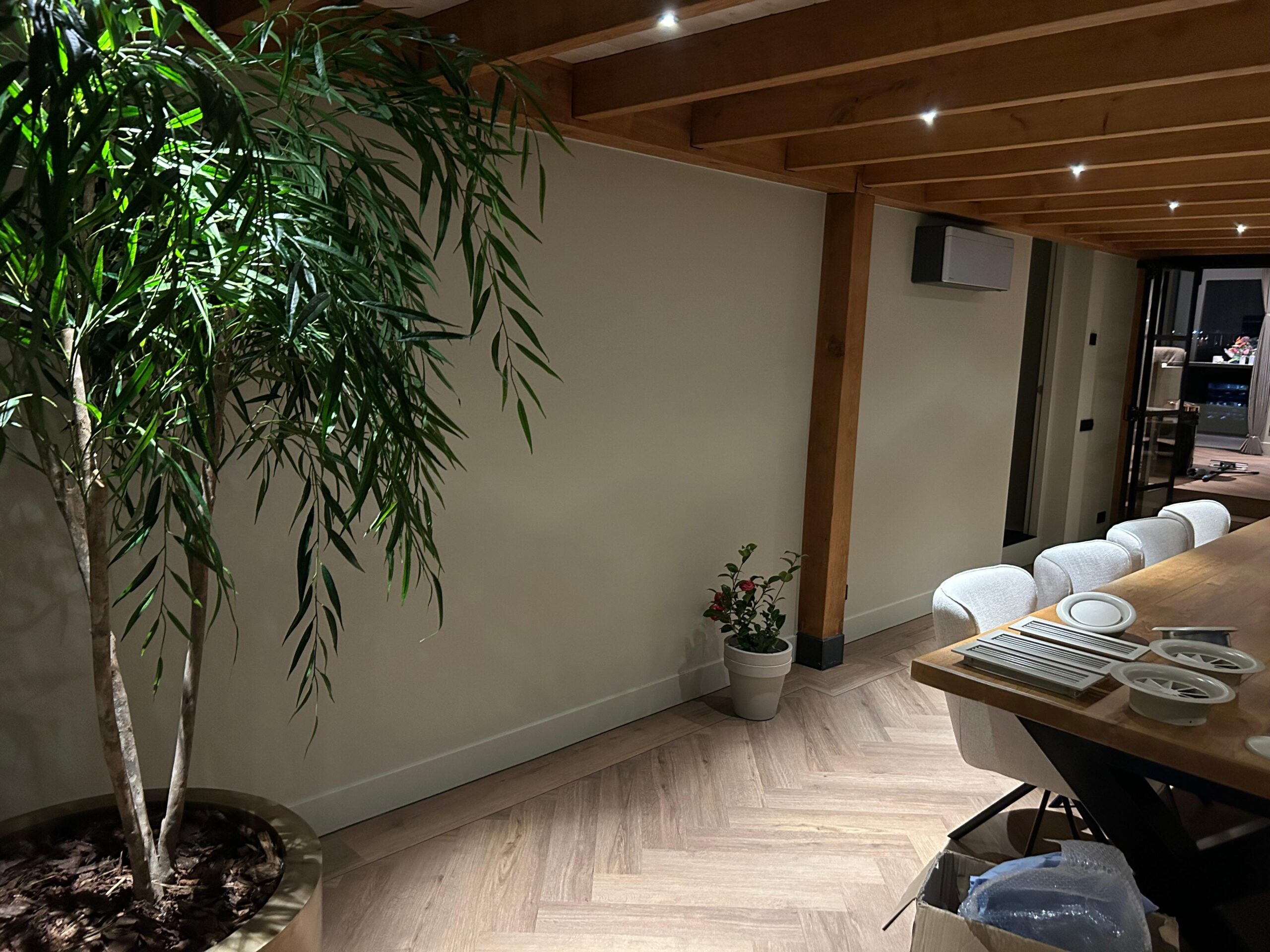 In deze ruimte hebben we de vloeren en wanden volledig afgewerkt, met oog voor detail bij de plinten en aansluitingen. De combinatie van een warme vloer en strak gespoten wanden zorgt voor een rustige, sfeervolle uitstraling. Alles sluit naadloos op elkaar aan, precies zoals de bewoners het voor zich zagen.