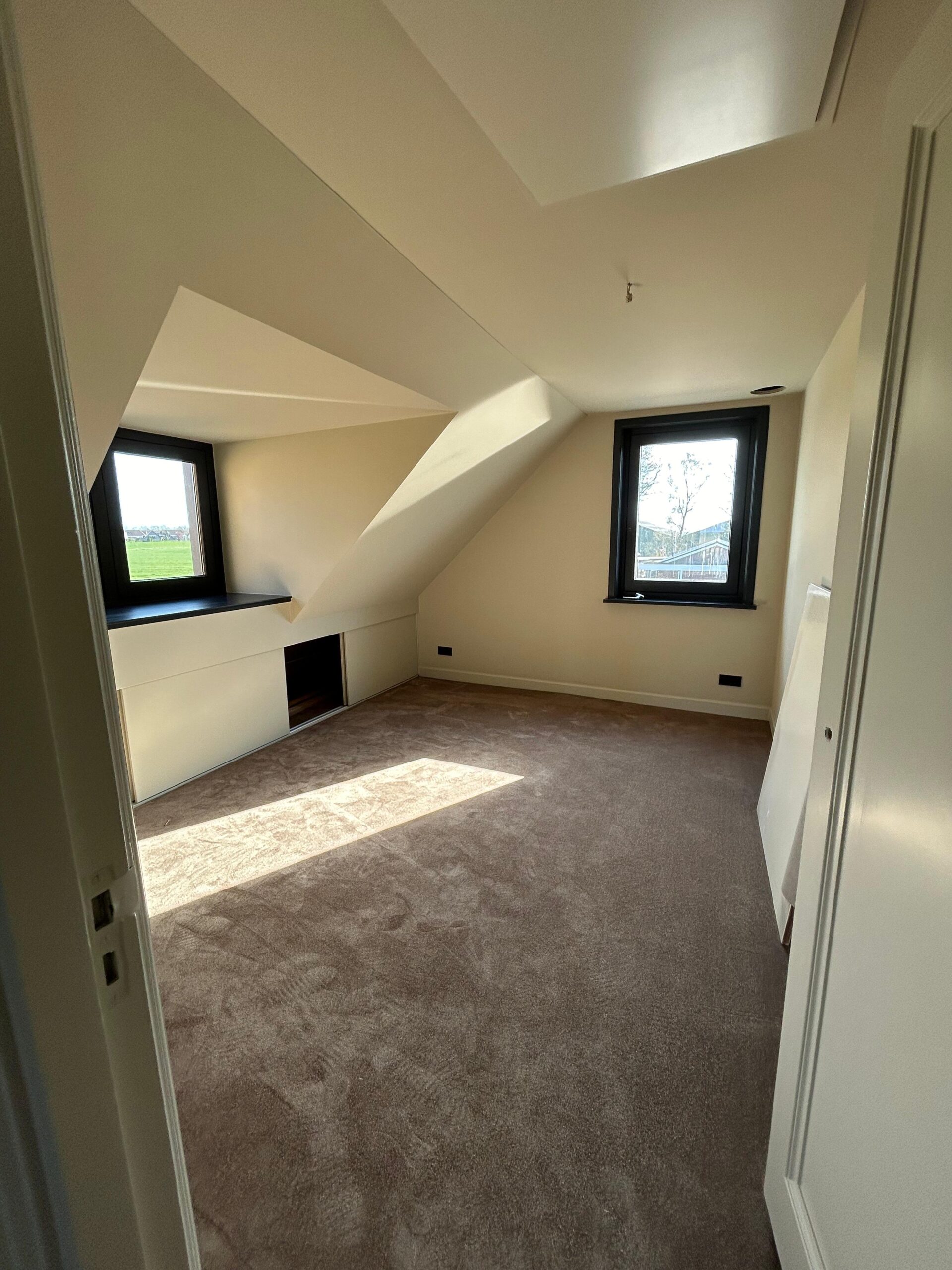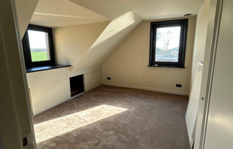 Van het hoge trapgat met nieuwe inbouwspots tot de ruime woonkamer met grote raampartijen: elke ruimte is zorgvuldig afgeplakt, gecorrigeerd en in één stuk gespoten voor een naadloos resultaat zonder aanzetten. Ook de uitdagende elementen, zoals schuine dakvlakken, haardwanden en strakke lijnen rond kozijnen en deuropeningen, zijn met precisie behandeld.