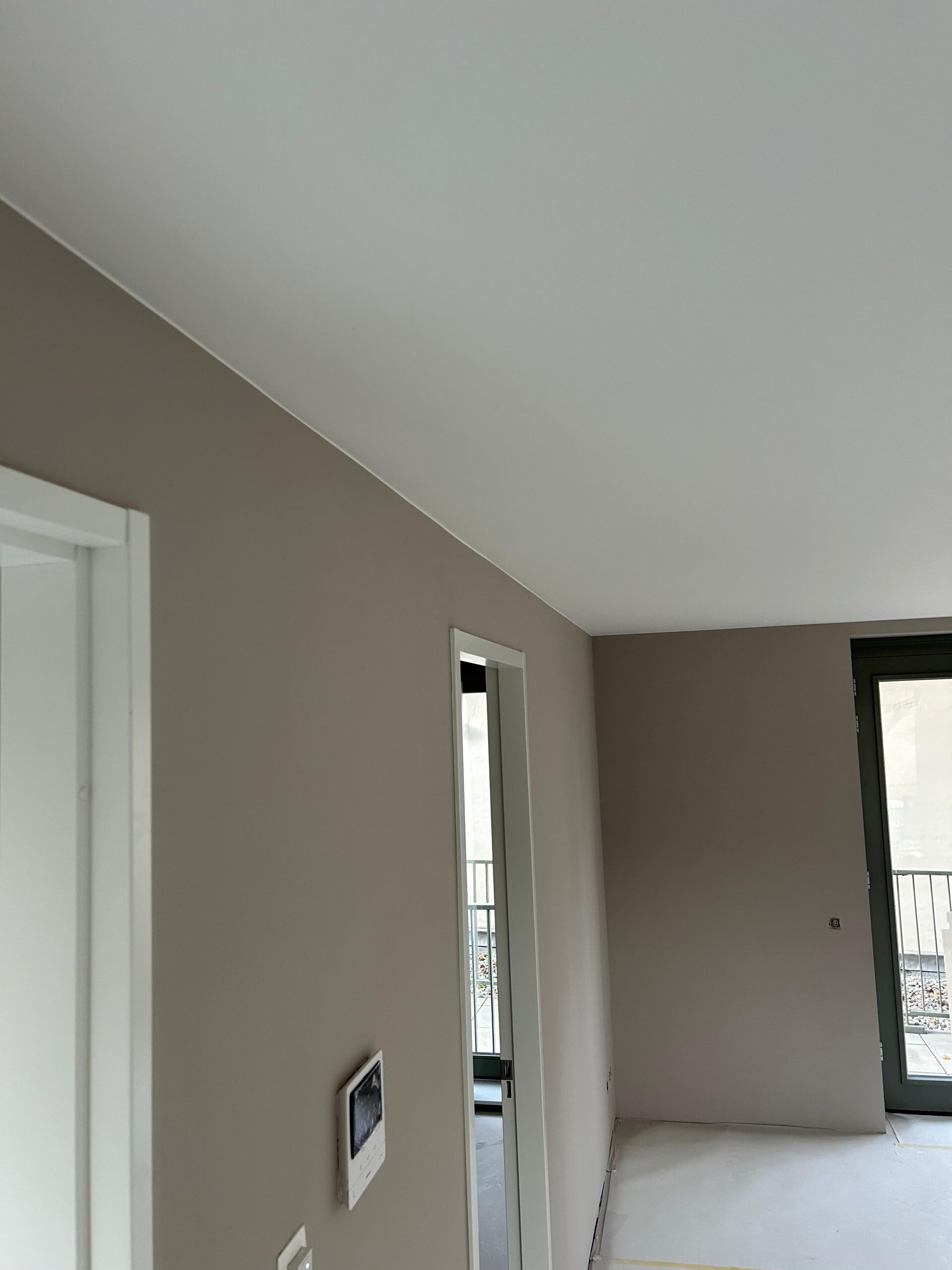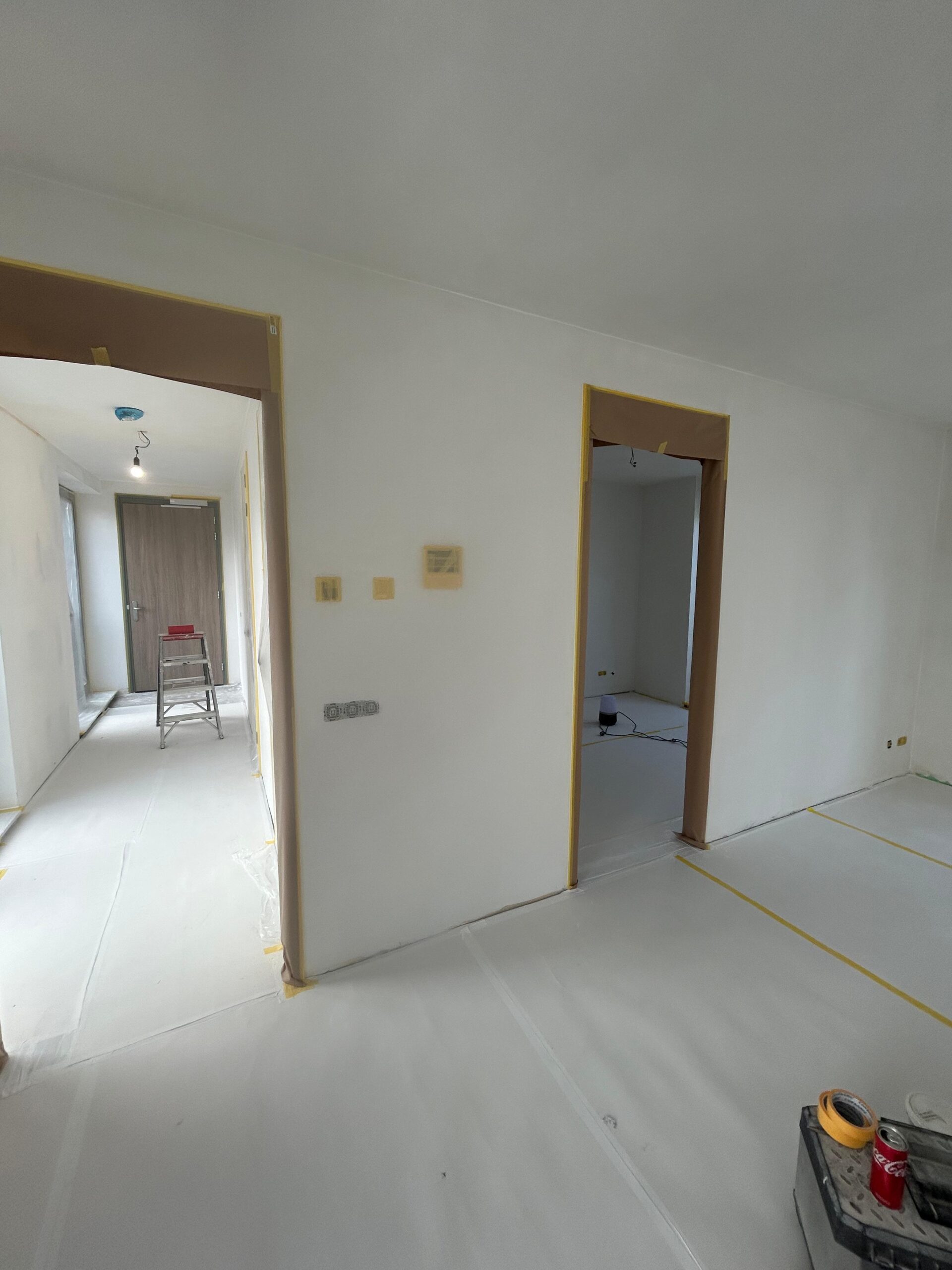 Bij dit project hebben we alle wanden en plafonds volledig voorbereid, afgeplakt en vervolgens strak gespoten. De matte afwerking zorgt voor een rustige, egale uitstraling zonder zichtbare banen of kwaststrepen. De overgang tussen wand en plafond is haarscherp afgewerkt, met aandacht voor elk detail rondom kozijnen, deuren en aansluitingen.