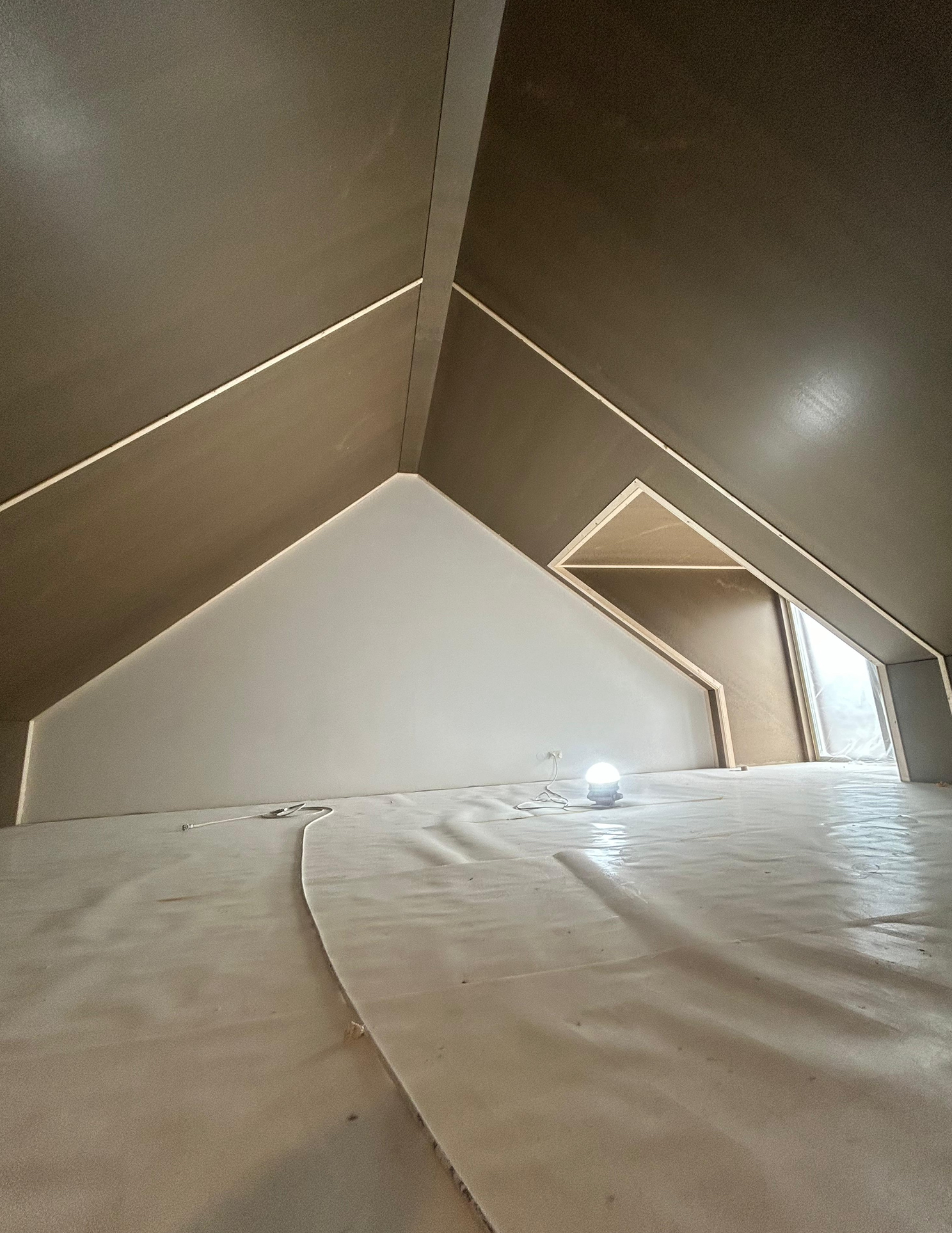 Op deze zolder hebben we zowel de wanden als plafonds volledig voorbereid en strak gespoten. De ruimte heeft veel schuine vlakken en hoeken, waardoor precisie en oog voor detail essentieel waren. Door het spuiten in plaats van rollen zijn de overgangen tussen wand en plafond volledig naadloos en egaal gebleven, zonder strepen of banen.